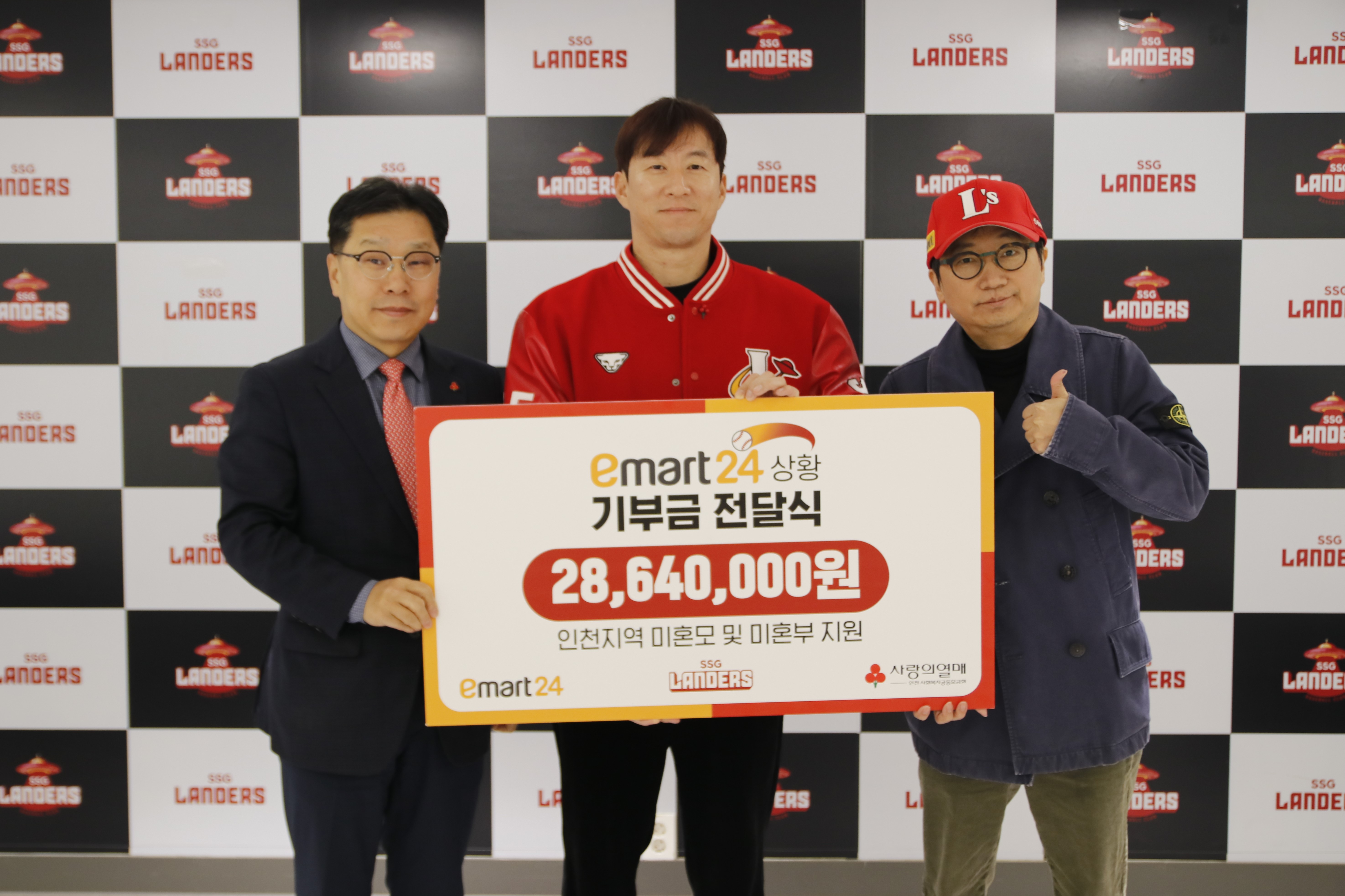 MEDIA 글자 크기 보통 크게 아주 크게 공유하기 페이스북 X 카카오톡 링크 복사 링크 복사됨 도구 보기 이미지 다운로드 SSG랜더스, 이마트24와 함께 ‘삼진 기부 캠페인’ 기부금 전달식 진행 2023.11.17 이마트24