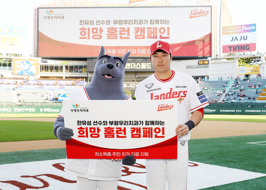 SSG랜더스(대표이사 민경삼) 한유섬 선수가 부평우리치과(원장 김재인)와 함께 하는 ‘희망 홈런 캠페인’을 8년 연속으로 진행한다.