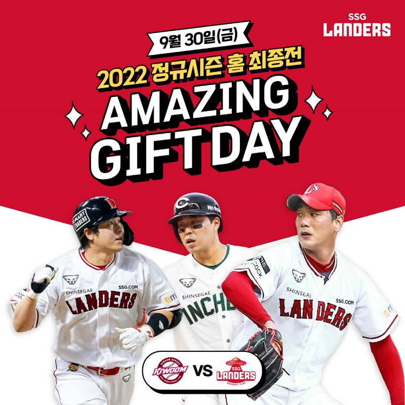 SSG랜더스(대표이사 민경삼, 이하 SSG)가 오는 30일(금) 키움 히어로즈와의 정규시즌 마지막 홈경기에서 그동안 팬들이 보내준 응원에 보답하기 위해 ‘Amazing Gift Day’를 진행한다.