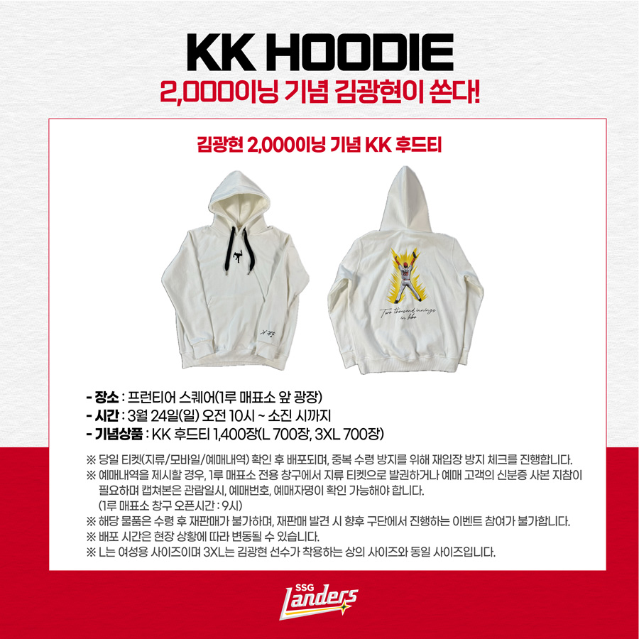 SSG랜더스(대표이사 민경삼, 이하 SSG)는 24일(일) 인천SSG랜더스필드에서 열리는 롯데 자이언츠와의 홈경기에서 ‘KK 2,000 Hoodie’ 이벤트를 실시한다.