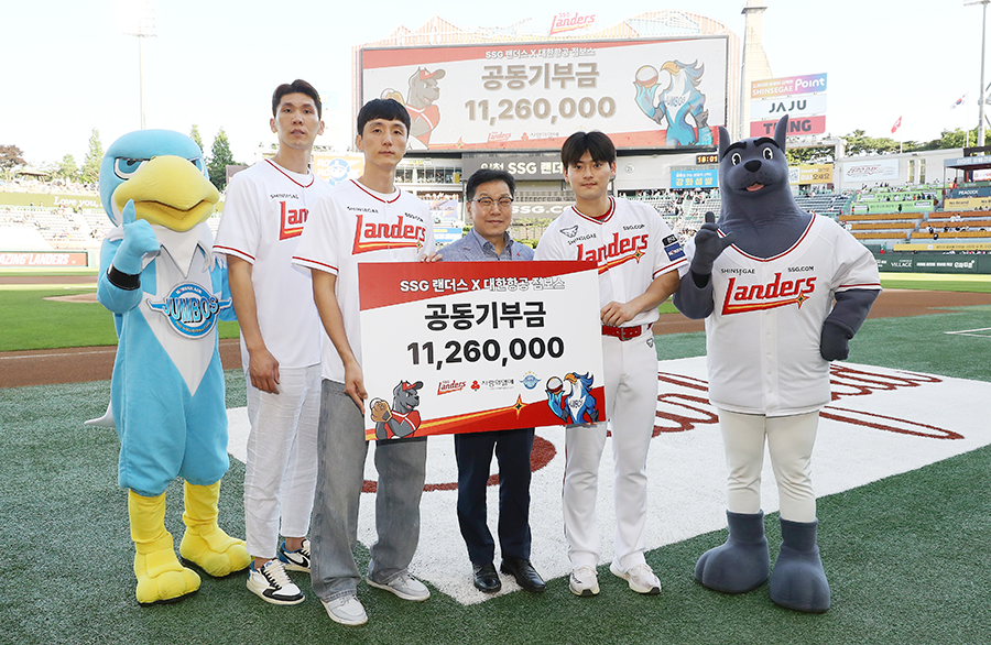 SSG랜더스(대표이사 민경삼, 이하 SSG)가 6월 13일(목) 인천SSG랜더스필드에서 열리는 KIA타이거즈와의 홈경기에 앞서 대한항공과 이마트의 공동 기부금 전달식을 실시했다.