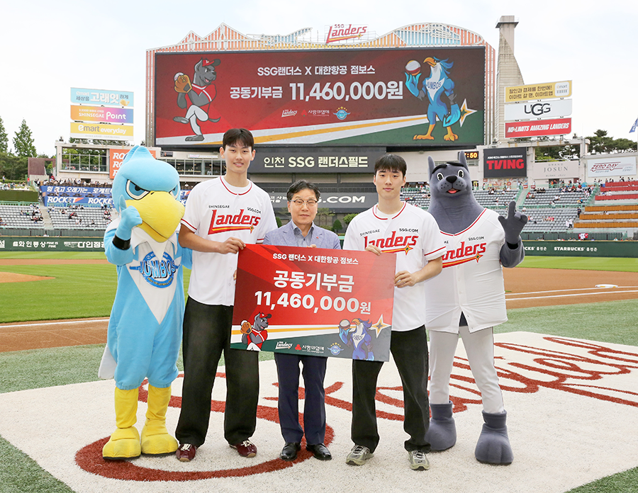 SSG랜더스(대표이사 김재섭, 이하 SSG)가 5일(목) 인천SSG랜더스필드에서 열린 삼성 라이온즈와의 홈경기에 앞서 대한항공과 이마트가 함께 진행하는 공동 기부금 전달식을 진행했다.