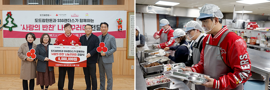 이날 인천광역시 미추홀구에 위치한 아동복지시설 향진원에서 진행된 본 전달식에는 SSG 고효준, 서진용 선수와 양사 임직원이 참여했으며, 다양한 제품으로 구성된 총 70박스의 ‘사랑의 반찬 나눔꾸러미’ 전달과 향진원 아동들을 위한 배식 봉사가 진행됐다.