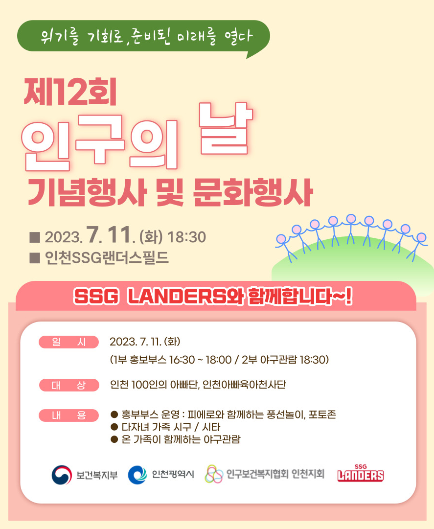 인구협회와 SSG는 야구장을 방문한 관람객을 대상으로 이번 행사의 슬로건인 ‘위기를 기회로, 준비된 미래를 열다’를 알리고 ‘부부가 함께하는 육아 실천’ 캠페인을 집중 홍보해 인구 문제에 대한 이해와 관심을 높일 계획이다.