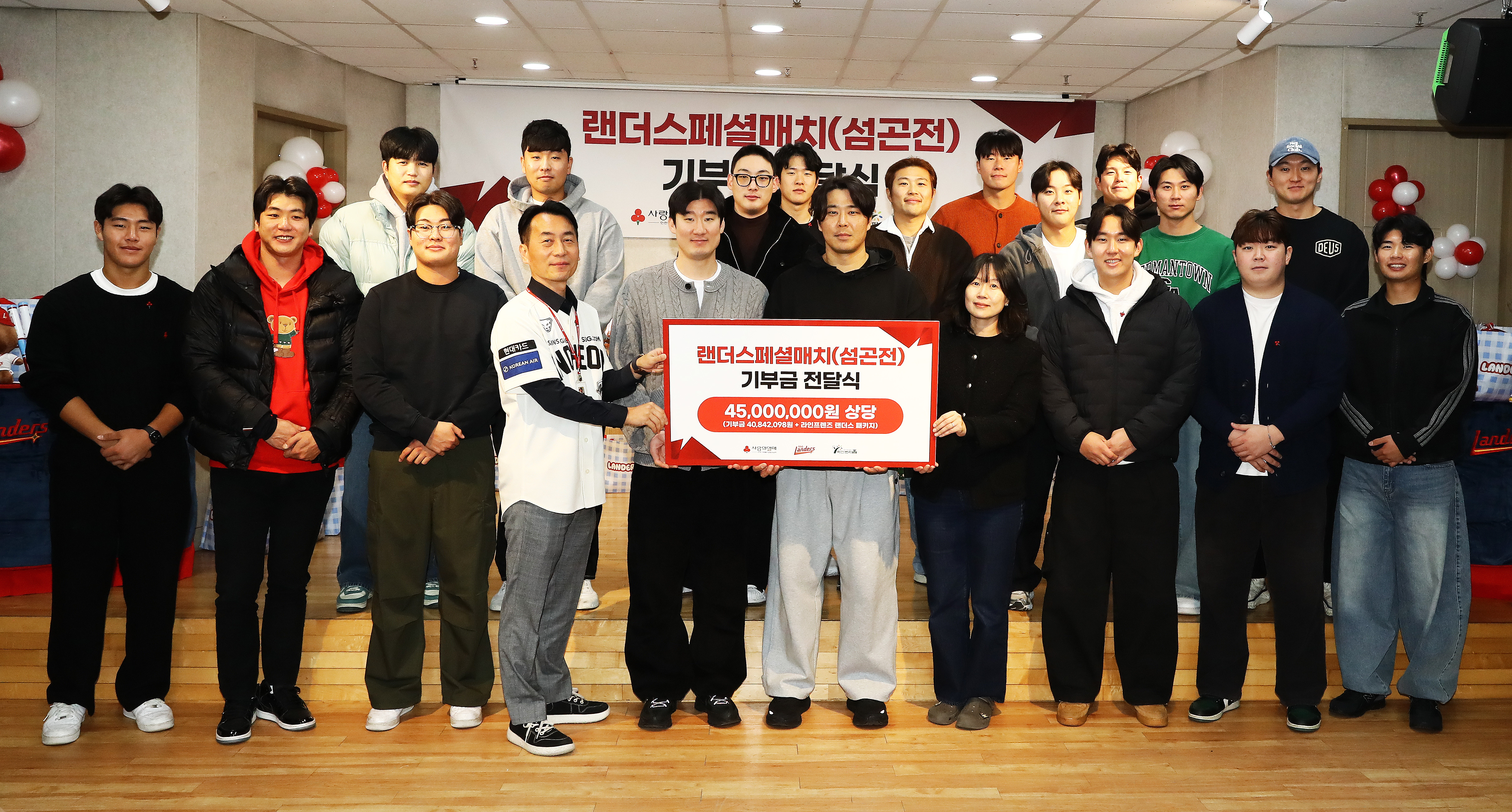 MEDIA 글자 크기 보통 크게 아주 크게 공유하기 페이스북 X 카카오톡 링크 복사 링크 복사됨 도구 보기 이미지 다운로드 SSG랜더스, ‘섬곤전’ 수익금으로 따뜻한 나눔 실천 2025.12.08 신세계야구단