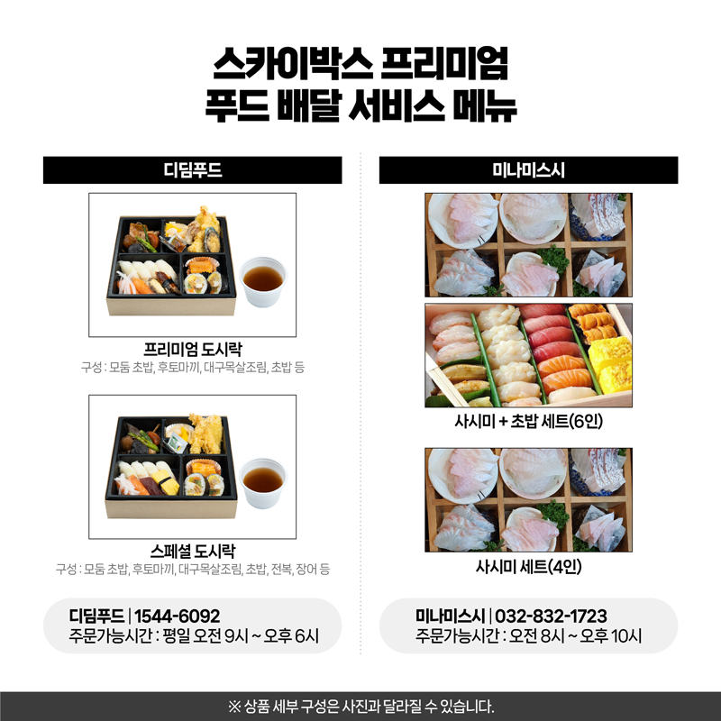 또한 요리 서비스는 인천지역 야구장 인근 일식 맛집으로 유명한 ‘미나미스시’와 함께 개발한 것으로, 고급 찬합에 숙성회와 해산물이 담겨서 제공된다. 가격은 사시미+초밥 세트(6명 이용 기준) 30만원, 사시미 세트(4인 이용 기준) 25만원이며 각 세트 당 3개씩 선착순으로 판매된다. 인원 수에 따른 추가 사시미 주문 금액은 4인당 10만원이다.