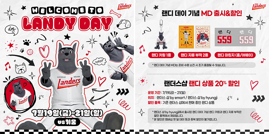 이어 랜디 디자인이 새롭게 적용된 상품도 출시된다. 이번 신규 상품은 랜디 키링, 지류 부적, 유니폼 마킹지로 인천SSG랜더스필드 내 1루 복도에 위치한 ‘랜더스 샵 by Hyungji’에서 판매된다. 더불어 3연전 동안 랜디 디자인이 들어간 일부 상품이 20% 할인된 가격으로 판매된다.