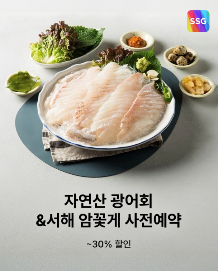 SSG닷컴은 제철 서해 자연산 대광어와 활 암꽃게를 최대 30% 할인가에 한정수량 예약 판매한다고 24일 밝혔다. 주문은 오는 28일까지 가능하며, 배송은 29일 시작된다.