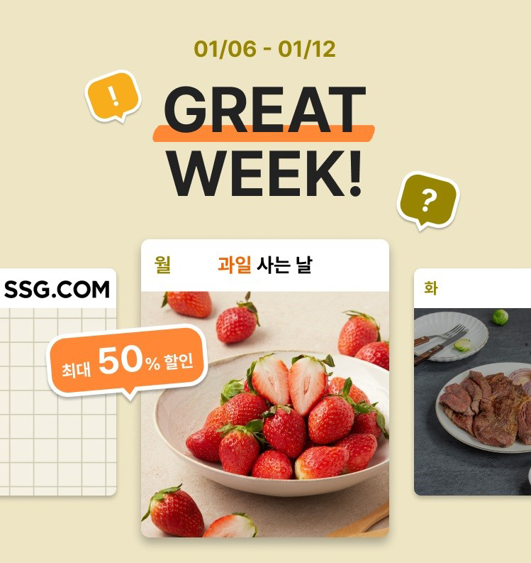 SSG닷컴이 을사년 새해를 맞아 오는 12일까지 일주일간 장보기 상품 릴레이 특가 행사 ‘그레잇 위크(Great Week)’를 진행한다고 6일 밝혔다.