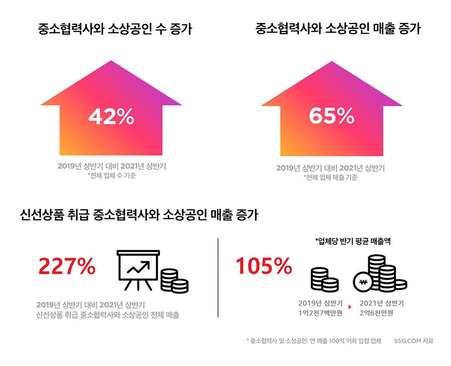 실제로 지난 2019년 상반기 SSG닷컴에 입점한 농어민 협동조합을 비롯한 신선상품 취급 소상공인과 중소협력사의 전체 매출은 올해 227% 늘어난 것으로 나타났다. 판매 규모가 커지면서 업체당 반기 평균 매출액은 같은 기간 1억2천7백만원에서 2억6천만원으로 105% 신장한 것으로 집계됐다.