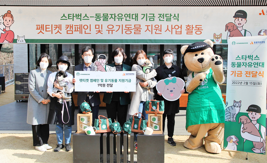 스타벅스는 2월 15일 경기도 남양주시 화도읍에 위치한 스타벅스 더북한강R점에서 동물자유연대에 유기동물 지원 기금 1억원을 기부하는 기금 전달식을 진행했다.