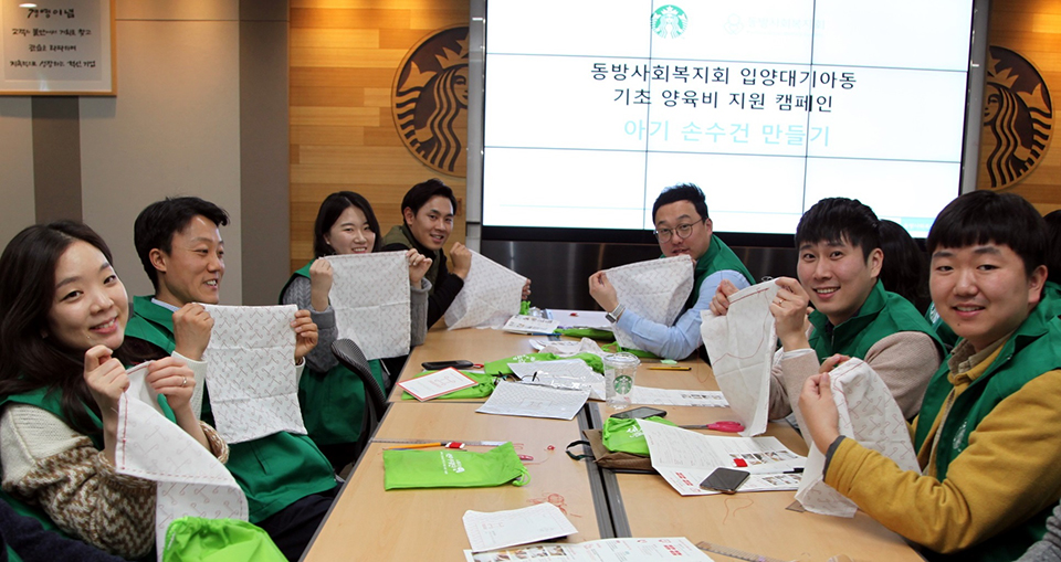 ㈜스타벅스커피 코리아(대표이사 이석구) 임직원 100여 명이 12월 20일 중구 소공동에 위치한 스타벅스 지원센터에서 새로운 가정을 기다리는 아기들을 위한 생필품인 가제 수건 만들기 봉사활동을 진행했다.