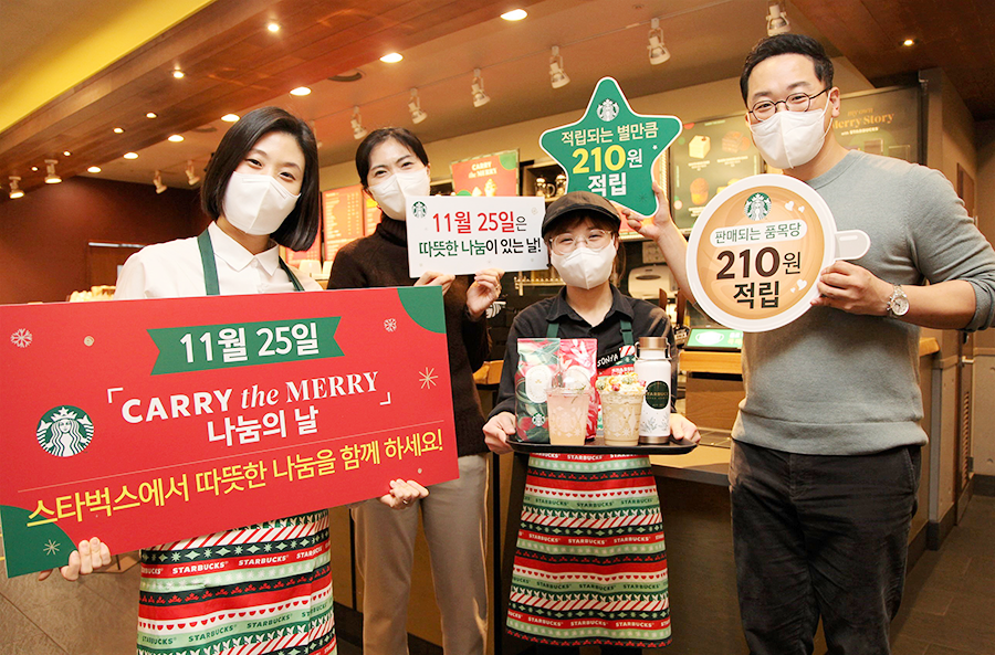 ㈜스타벅스커피 코리아(대표이사 송호섭)가 다가오는 연말 크리스마스 시즌을 맞아 11월 25일 수요일 하루를 ‘CARRY the MERRY’ 나눔의 날로 지정하며, 크리스마스 시즌 기금 2억 1천만원을 포함해 누적 최대 5억원의 기금을 우리 지역사회에 전달하는 고객 동참형 기금 적립 행사를 전개한다.