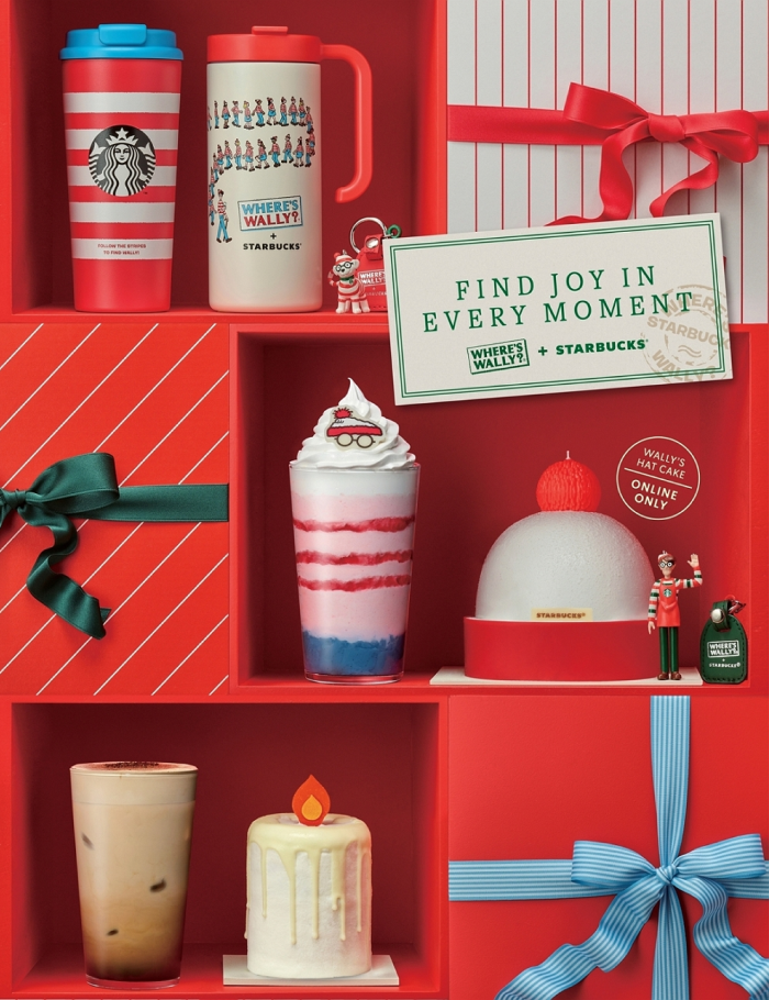 콜라보레이션 음료인 ‘월리 체리 푸딩 크림 프라푸치노’는 체리 드리즐, 블루 바닐라 푸딩 등으로 월리의 트레이드 마크인 빨간 스트라이프 티셔츠와 파란색 청바지를 형상화해 인증샷 욕구를 자극한다. ‘월리 레드벨벳 치즈 케이크’, ‘월리 베어리스타 마카롱’도 월리 모티브 장식으로 재미 요소를 더했다.