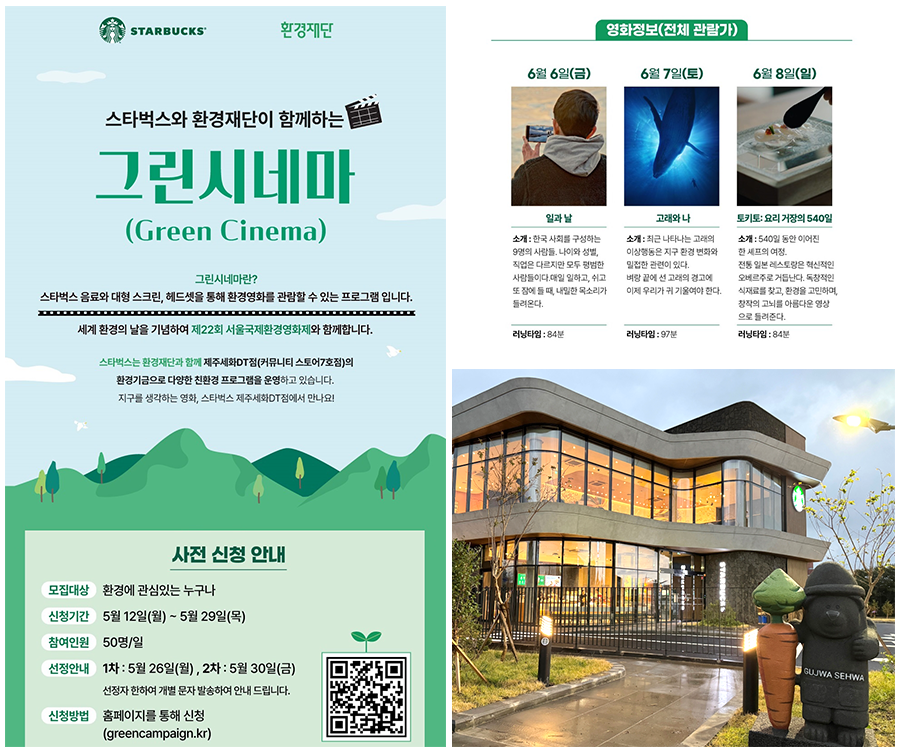 스타벅스 코리아(대표이사 손정현)가 6월 5일 세계 환경의 날에 맞춰 제주세화DT점에서 환경재단과 함께 개최하는 그린 시네마 행사 사전 참석 신청을 5월 12일부터 5월 29일까지 행사 홈페이지(greencampaign.kr)에서 진행한다.