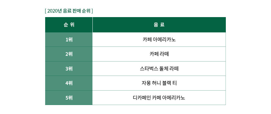스타벅스에서 지난 한 해 가장 많이 판매된 음료는 ‘카페 아메리카노’로 13년 연속 인기 음료1위 자리를 지켰다. 이처럼 변함없이 사랑을 받는 음료가 있던 반면에, 사회적 거리두기로 인해 많은 부분의 변화가 있었던 2020년이었다.