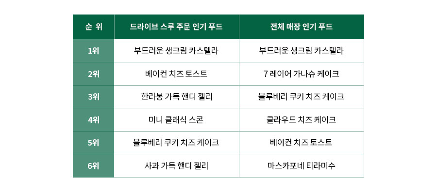 한편, 드라이브 스루 고객의 푸드 구매 성향을 살펴보면 ‘한라봉 가득 핸디 젤리’, ‘사과 가득 핸디 젤리’, ‘미니 클래식 스콘’과 같이 차 안에서 간편하게 섭취할 수 있는 간식류가 많이 팔린 것으로 나타나 전체 매장에서 케이크 상품들이 순위에 오른 것과 대비된다. 이는 드라이브 스루에 어린이를 동반한 가족단위 고객의 방문이 많은 것으로 해석된다.