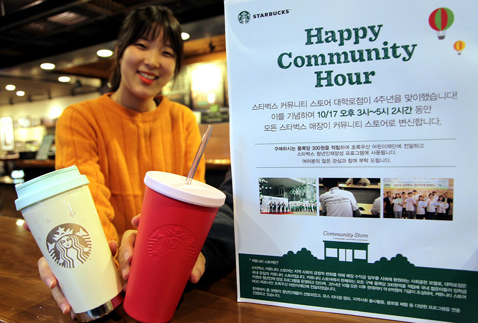 국내 유일의 커뮤니티 스토어로 운영되고 있는 스타벅스 대학로점은 지역사회에 긍정적인 변화와 장기적인 발전에 기여하기 위해 수익금 일부를 지역사회에 환원하는 이익공유형 매장이다.