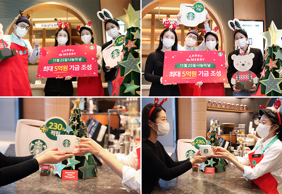 스타벅스 코리아(대표이사 손정현)가 연말 크리스마스 시즌을 맞아 11월 25일 하루 동안 고객이 구매한 품목 및 적립 별에 따라 최대 5억 원의 기금을 조성해 지역사회 NGO 단체에 전달하는 ‘캐리 더 메리(CARRY the MERRY) 나눔의 날’ 행사를 진행한다.