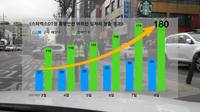 3월 업무 협약식 이후 현재까지 스타벅스는 지속적으로 어르신 일자리 창출을 지원해 왔다. 27개 드라이브 스루 매장에서 110명의 어르신 교통안전 관리원이 근무 했던 협약식 초기 대비, 최근에는 어르신들의 열정적인 노력과 지역사회의 긍정적인 피드백에 힘입어, 스타벅스 41곳의 매장으로 일터의 영역을 확대해, 63% 증가한 180명의 어르신 분들이 현재 통행안전 관리원으로 근무하고 있다.