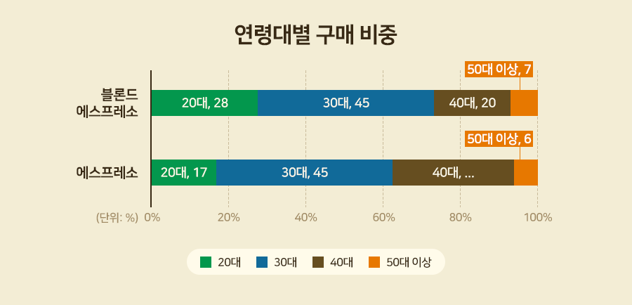 스타벅스 리워드 회원의 구매 성향을 살펴보면 블론드 에스프레소 음료 열 잔 중 7잔을 MZ 세대인 20~30대가 구매하는 것으로 나타났으며, 40대 이상 연령층은 블론드 에스프레소에 비해서 기본적인 에스프레소 음료의 구매 선호도가 더 높은 것으로 나타났다.