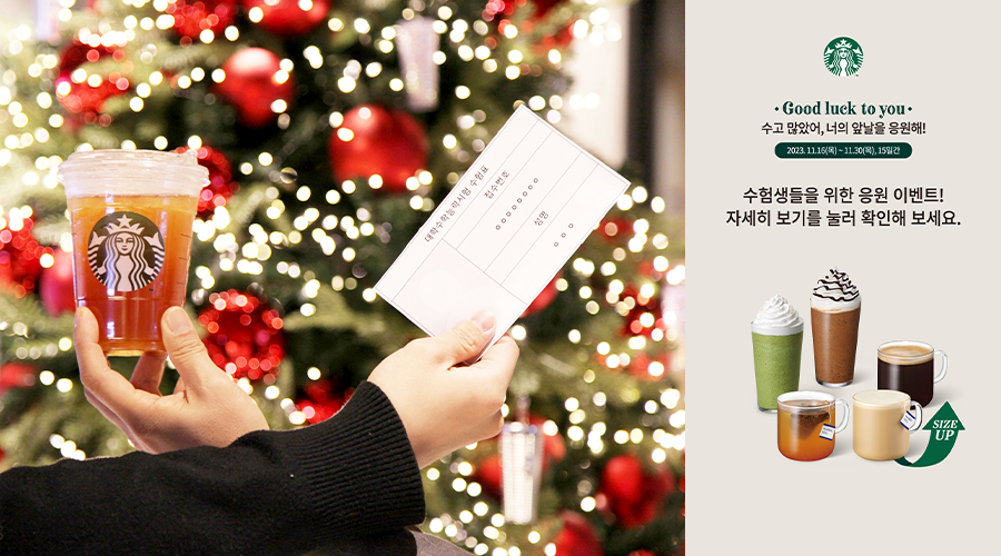 스타벅스 매장에서는 ‘2024학년도 대입수학능력시험 수험표’를 보여주며 대상 음료 5종을 주문 시 무료로 한 사이즈 업그레이드하여 제공한다. 무료 사이즈 업그레이드 혜택은 수험표 확인을 위해 현장 주문을 통해서만 가능하다.