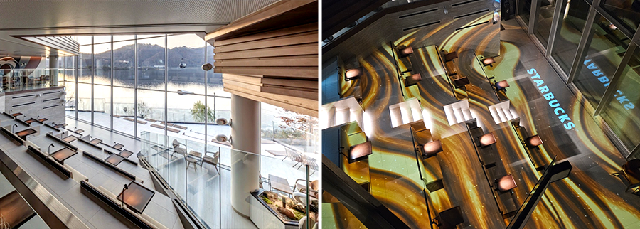특히, 더여수돌산DT점 1층에는 전세계 스타벅스 최초로 투명 LED패널을 활용한 8미터 길이의 초대형 투명 디스플레이 테이블이 설치됐다. 해당 디스플레이 테이블은 테이블 중앙 센서가 화면 위에 올려진 커피잔을 감지해 마치 바닷가에 앉아 커피를 마시는 듯한 간접경험을 제공한다.