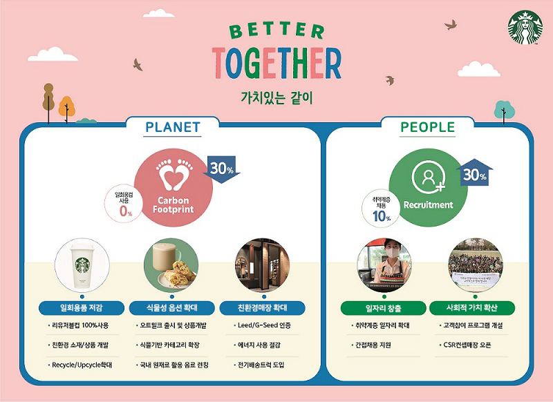‘Better Together’ 프로젝트는 더 나은 세상, 지속 가능한 미래를 꿈꾼다. 스타벅스커피 코리아는 환경이 미래 세대를 위해서 반드시 지키고 보호해야 할 자산이라는 것을 되새겼다. 그래서 탄소 감축 30%라는 중장기 계획 아래, ‘우리가 배출한 쓰레기는 우리 손으로 책임진다’는 기업의 사회적 책임 관점에서 ‘일회용품 사용률 0% 도전’이라는 목표를 세웠다.