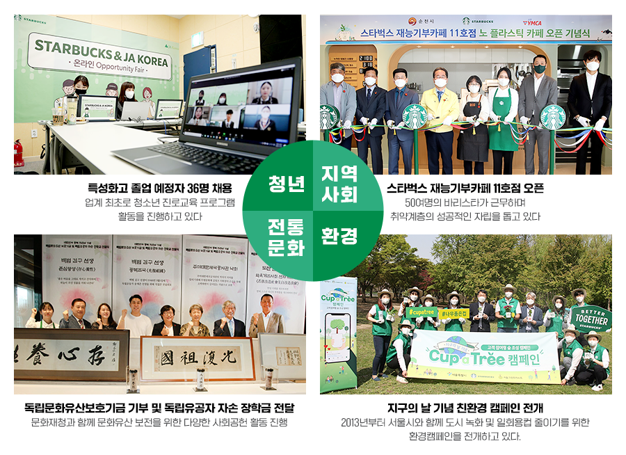 스타벅스커피 코리아는 파트너, 고객, 이웃 사회 모두가 함께 성장하는 것을 최고의 가치로 삼는다. 이를 위해 ▲청년 ▲지역사회 ▲전통문화 ▲환경으로 테마를 나눠 적극적인 사회공헌활동을 펼쳐왔다. 특히 채용 지원 측면에서는 세심한 사업을 진행했다.