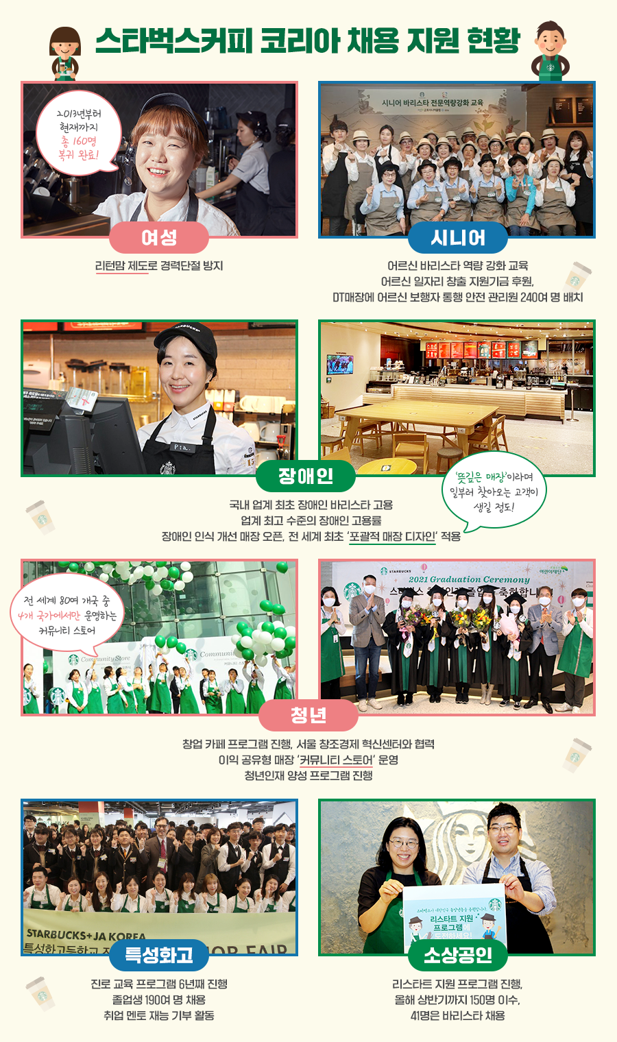한편, 장애인 바리스타의 경우 단순히 채용 확대에 그치지 않았다. 지난해 12월에 오픈했던 서울대치과병원점은 장애인 고용 증진 및 장애 인식 개선을 위한 매장이다. 매장 전체 인원 중 절반은 다양한 직급의 장애인 파트너이며, 2021 장애인 바리스타 챔피언십 우승자가 수퍼바이저로 근무 중이다. 장애인 바리스타들에게 성장의 기회와 지속적인 관심을 제공하는 것이 알려지자, 최근에는 매장이 병원 내에 있음에도 “뜻깊은 매장”이라며 일부러 찾아오는 고객들도 생기고 있다.