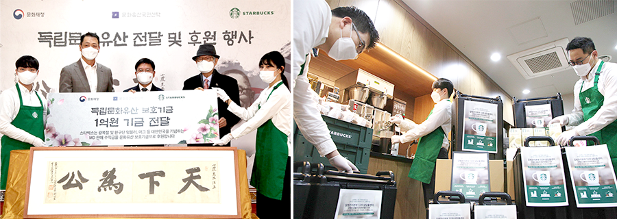 스타벅스커피 코리아의 감도 높은 사회공헌 활동은 파트너들에게도 자부심을 안겼다. 파트너들은 ‘우리 회사의 활동으로 인해 사회적 이슈에 더욱 관심을 갖게 되었다’고 입을 모은다. 이제 파트너들은 스스로 행동한다. 코로나19가 덮쳤던 작년 2월, 질병관리본부 1339 콜센터 상담원 대상 커피 지원 활동이 대표적인 예다. 서울 경기 지역 콜센터에 2주간 하루 500잔씩 지원하는 것이 당초 계획이었으나, 많은 파트너들이 참여 의사를 밝혔다. 그에 따라 원주, 부산 등 전국 콜센터에 하루 600잔씩 지원하는 것으로 지원활동 범위를 늘렸다. 그 외에, 플로깅이나 나무 심기 같은 릴레이성 봉사활동 참여자는 올 상반기만 2,500명을 넘어섰다. 사회공헌 활동에 대한 내부의 적극적인 지지는 스타벅스커피 코리아의 상생 경영에 박차를 가하는 역할을 한다. 스타벅스커피 코리아는 작년부터 본격적으로 보호종료아동 지원을 시작했으며, 문화재 지킴이로서 문화유산 보전에도 더욱 힘쓰고 있다. 2009년부터 이어 온 문화유산 보호 활동의 일환으로 지난해에 독립문화유산 보호기금과 독립유공자 자손 장학금으로 각 1억 원을 쾌척했으며, 지난 3월에는 김구 선생의 친필휘호 ‘천하위공’도 기증했다. 사람에 집중한 경영 활동을 펼쳤을 때 어떤 선순환이 이뤄지는지 알 수 있는 좋은 예다.