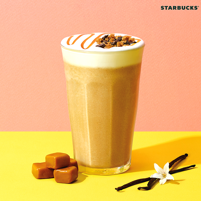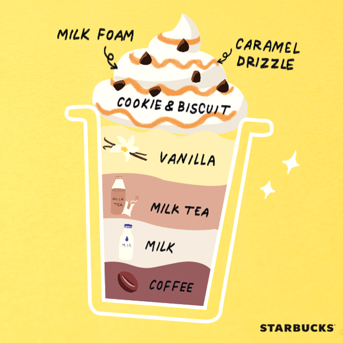 ‘바밀카쿠 프라푸치노’는 부드러운 커피와 밀크 티가 조화롭게 어우러지는 맛에 초콜릿 칩 쿠키가 콕콕 씹히는 재미를 더한 음료다. 1단계 커피, 2단계 우유, 3단계 밀크 티, 4단계 바닐라, 5단계 밀크 폼, 6단계 쿠키 토핑, 7단계 카라멜 드리즐 등 고객이 직접 선택한 레시피로 개발된 최초의 음료라는 점에서 의미가 깊다.