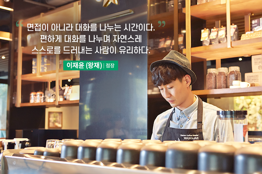 점장으로 근무하면서 그동안 많은 면접을 진행했다. 사내에 ‘스타벅스 사명과 가치’에 부합하는 면접 가이드가 있는데 이를 바탕으로 상황에 맞추어 질문한다. 면접이긴 하나 편안한 대화 분위기를 조성하여 지원자를 파악하는 편이다. 새로운 업무환경에 적응할 수 있는지 묻고, 협동심을 잘 발휘하며, 스타벅스에 맞는 인재인지 가늠한다.