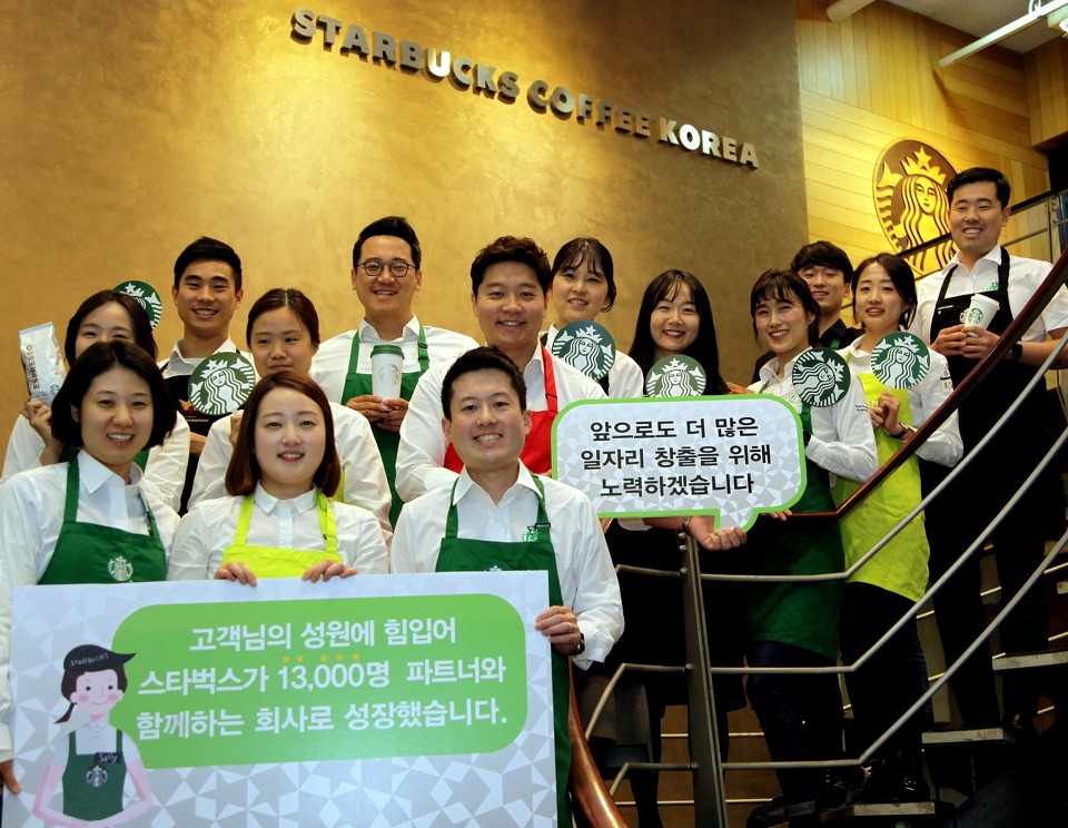 스타벅스는 연령, 성별, 학력, 장애 여부에 차별 없는 채용을 통한 열린 직장을 추구하고 있다. 현재 1만 3천명 파트너들이 바리스타부터 지역 매니저까지 모두 정규직으로 근무하고 있다. 공정거래위원회 대규모기업집단 공시자료를 통해 한국경제연구원이 30대 그룹의 종업원 300인 이상 계열사 종업원 수를 분석한 자료에서 최근 3년간(2013년~2016년) 임직원수가 가장 많이 증가한 기업 2위에 오른 바 있다.