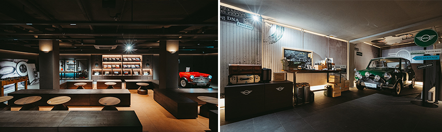 매장 정문을 들어서면 제일 먼저 만날 수 있는 차고와 아지트 공간을 배경으로, MINI의 클래식 차량을 비롯해 스타벅스 MD 등을 전시하고, MINI 콘텐츠를 LP커버에 담은 특별 사진전을 진행한다. 아울러, 마치 드라이브하며 음악을 듣는 듯한 경험을 제공하고자 MINI 차량 모형의 음악 감상 체험 공간도 마련했다.