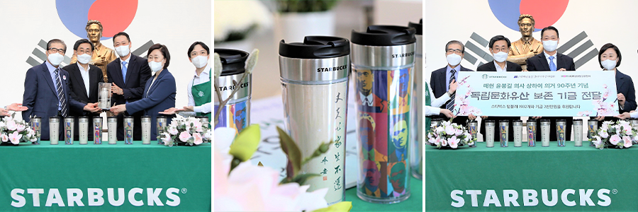 문화유산 보호활동에 앞장서고 있는 스타벅스 코리아(대표이사 송호섭)가 매헌 윤봉길 의사 상하이 의거 90주년을 기념하여 매헌윤봉길의사기념사업회(회장 명노승)와 매헌윤봉길월진회(회장 윤여두)에 독립문화유산 보존 기금 2천만원과 1,932개의 기념 텀블러를 전달했다.