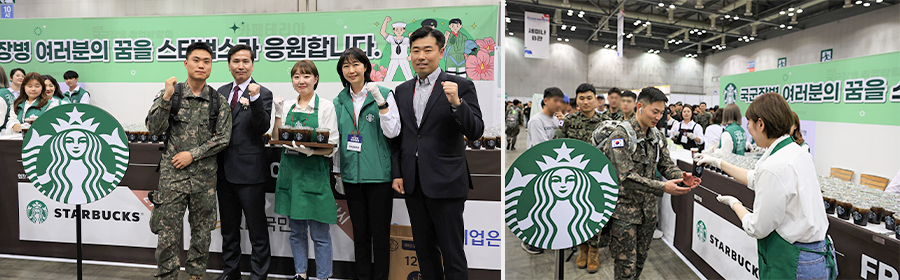 올해는 특히 국가를 위해 헌신한 국군장병들의 취업을 응원하고 본격적으로 지원하기 위해 스타벅스 채용 부스를 방문한 장병들에게 스타벅스 아이스 커피 2천 잔 분량을 제공하고, 스타벅스 바리스타 직업에 대한 전반적인 소개와 취업 상담을 진행했다.