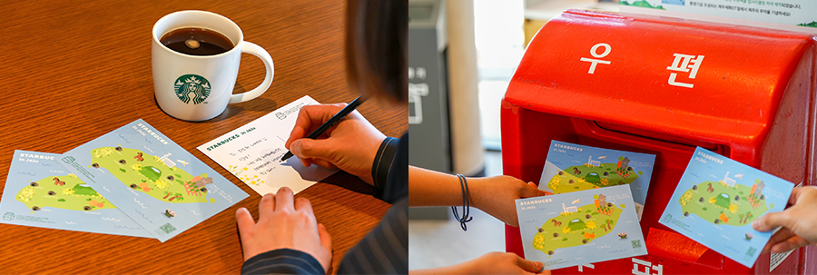 스타벅스는 #스타벅스 #제주세화DT점 #환경재단 해시태그를 달아 제주세화DT점 포토존 사진을 SNS에 인증하면 우유팩 재생지 엽서를 증정한다. 해당 엽서를 느린 우체통에 넣으면 1년 뒤에 기재한 주소로 무료로 발송된다.