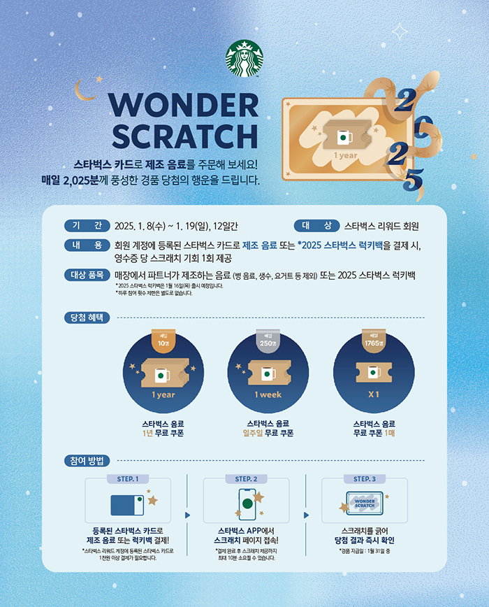 뉴이어 원더 스크래치 이벤트는 2025년 새해를 맞아 스타벅스 무료 음료 쿠폰의 당첨 행운을 얻을 수 있는 행사로, 이벤트 기간 동안 매일 2,025명에게 ▲스타벅스 1년 무료 음료 쿠폰(10명) ▲스타벅스 일주일 무료 음료 쿠폰(250명) ▲스타벅스 무료 음료 쿠폰 1매(1,765명) 등의 경품 혜택을 제공한다.