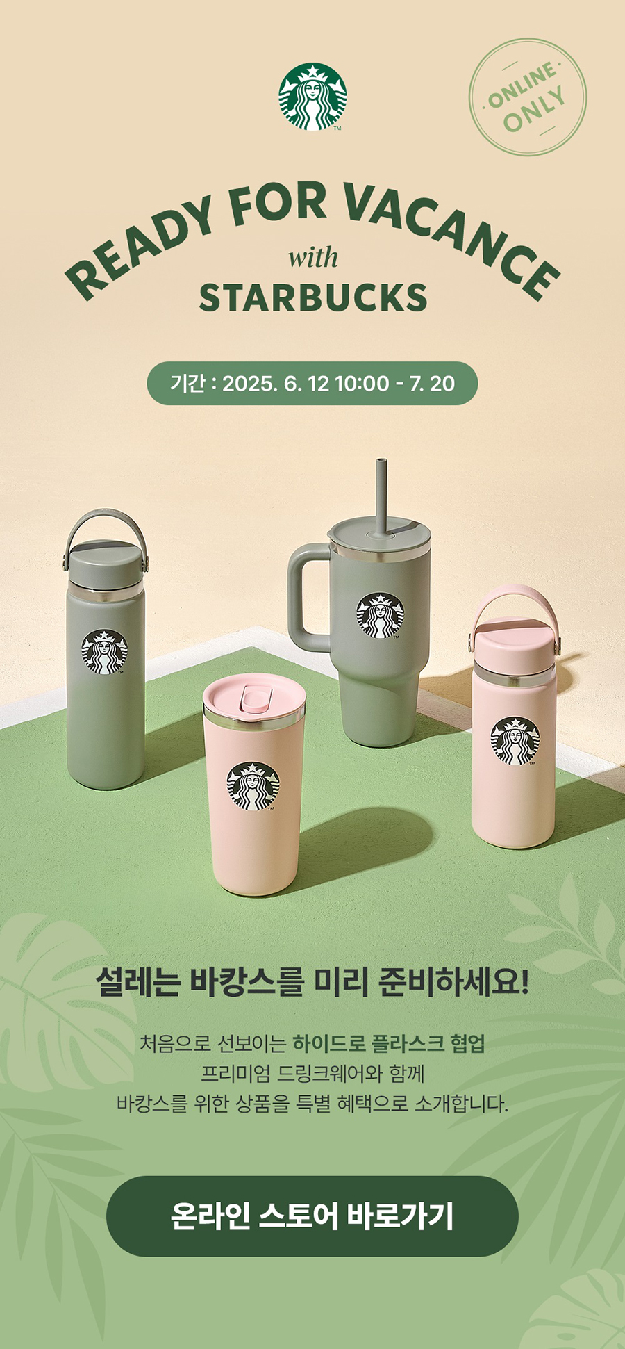 ‘레디 포 바캉스’ 기획전은 평년보다 일찍 찾아온 무더위로 인해 여름철 휴가를 미리 준비하길 원하는 고객을 위해 준비된 이벤트로, 스타벅스의 공식 온라인 스토어에서 대용량 텀블러를 포함해 바캉스와 어울리는 MD 상품을 7월 20일까지 할인된 가격에 만나볼 수 있다.