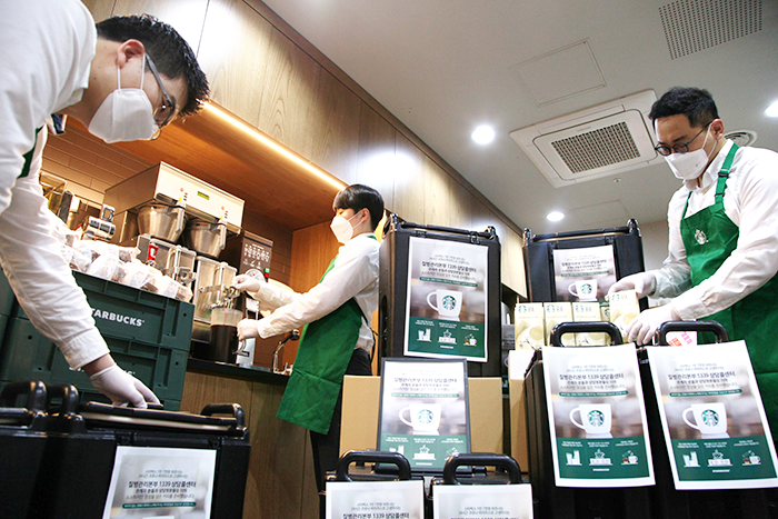 #.지난 2월 중순부터 스타벅스 지원센터(본사) 커피실습실에서는 오전만 되면 커피를 내리는 지원센터 파트너들로 북적였다. 질병관리본부 1339 콜센터에 보낼 커피를 내리기 위한 봉사 파트너들이었다.