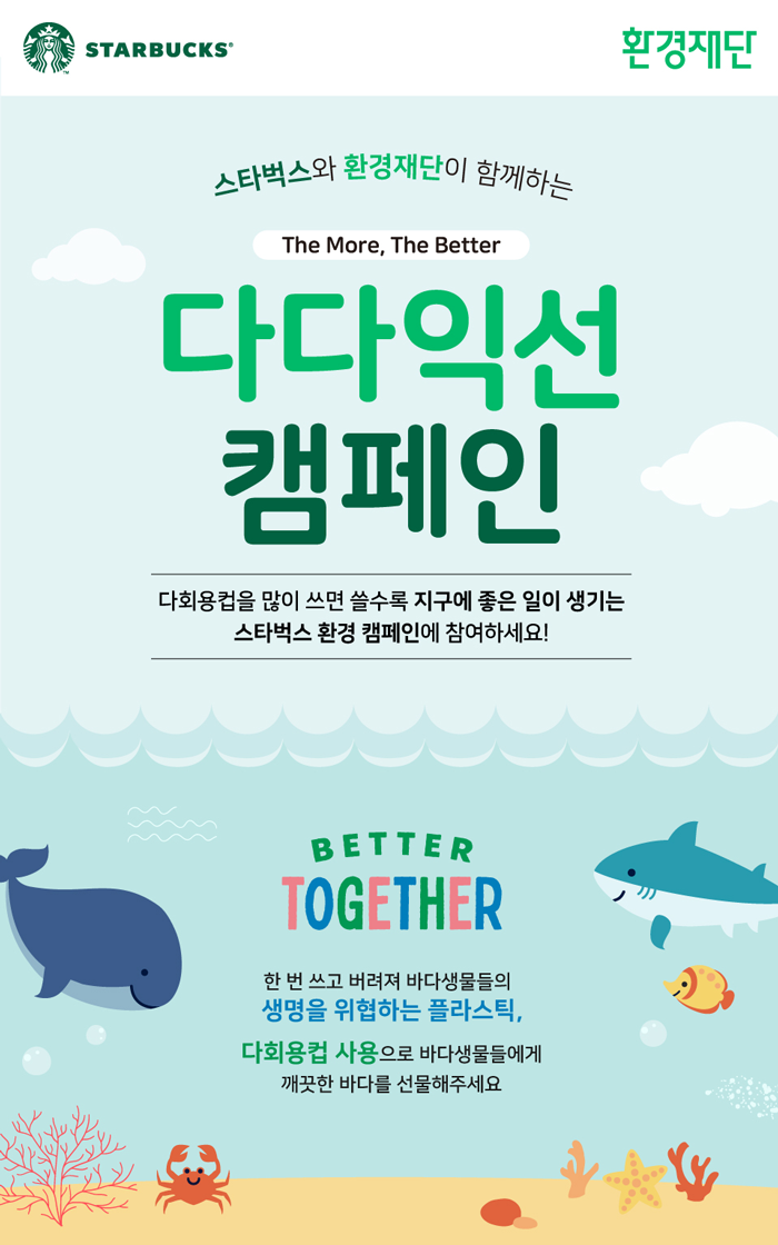 ‘다회용 컵을 많이 쓰면 쓸수록 지구에 좋은 일이 생긴다’는 의미의 다다익선 캠페인을 통해 고객들에게 다회용 컵 사용이 갖는 환경적인 메시지를 전달하고 보다 많은 고객들이 다회용 컵 사용에 동참할 수 있도록 할 예정이다.