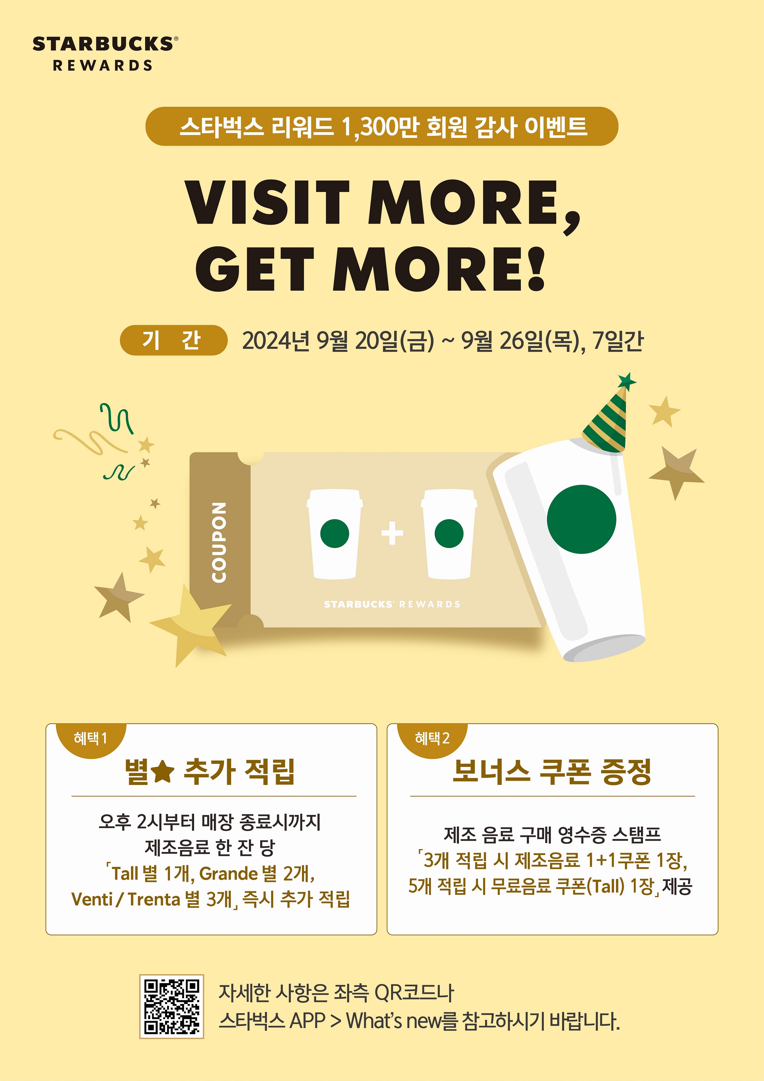 MEDIA 글자 크기 보통 크게 아주 크게 공유하기 페이스북 X 카카오톡 링크 복사 링크 복사됨 도구 보기 이미지 다운로드 스타벅스 리워드 회원 1,300만 명 돌파 기념 혜택 쏟아지는 고객 감사 이벤트 전개 2024.09.20 SCK COMPANY