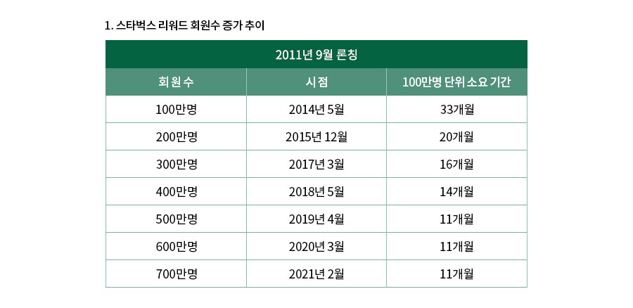 스타벅스 리워드 회원수는 지난해부터 이어지고 있는 언택트 소비 트렌드로 올해 들어 1월 한 달 간 시간당 가입자 수가 평균 160명을 넘어 회원 가입 속도가 지속적으로 증가하고 있다. 2014년 5월에 처음 100만명을 넘어선 이래 100만명 증가 기간이 빨라지면서 2019년 4월 500만명 돌파를 시작으로 100만명 단위 기간이 평균 11개월을 기록하고 있다.