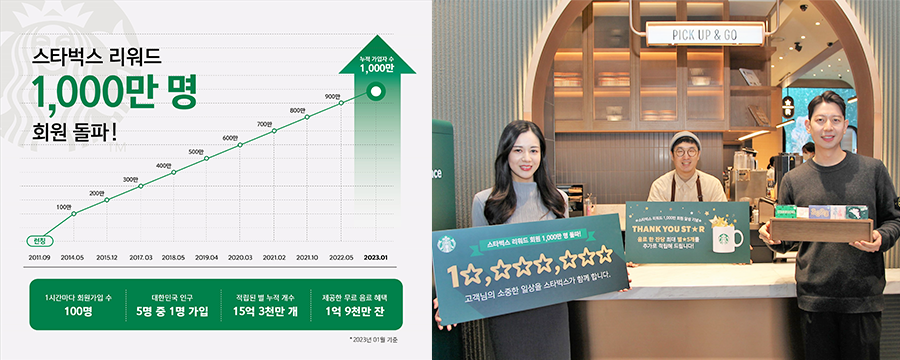 2011년 9월부터 서비스를 시작한 ‘스타벅스 리워드’는 스타벅스 카드 사용 고객들에게 다양한 혜택을 제공하는 로열티 프로그램으로, 회원 수 1천만 명은 스타벅스가 리워드 서비스를 시작한 후 11년 4개월이라는 기간 동안 1시간마다 100명 이상이 회원으로 가입한 수치이자 대한민국 인구(약 5,156만명 기준) 5명 중 1명에 해당된다.