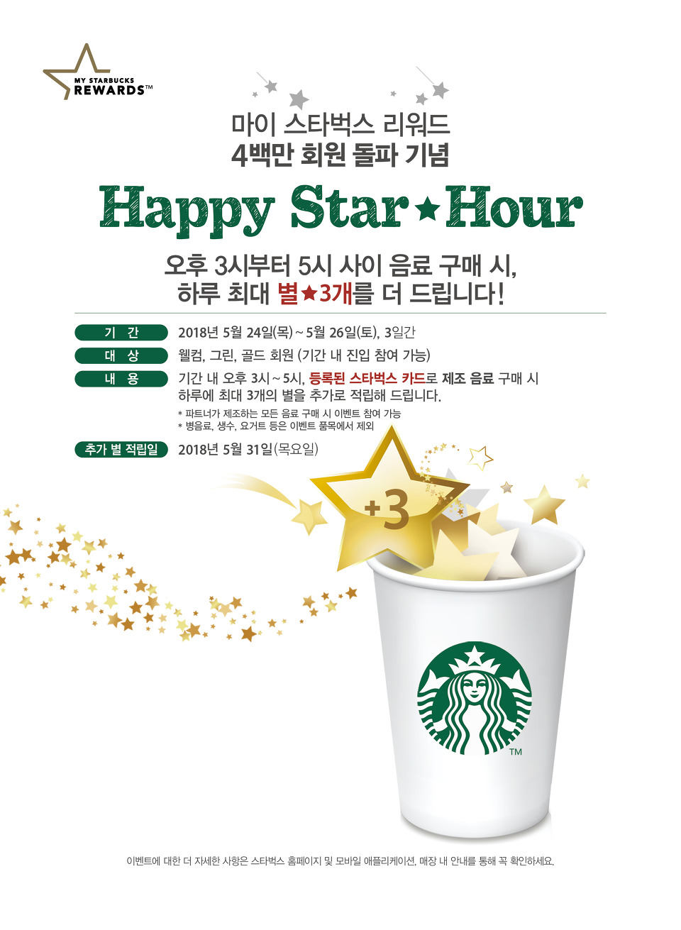 이와 더불어, 오는 오는 5월 24일부터 26일까지 3일간 오후 3시부터 5시 사이 “해피 스타 아워(Happy Star Hour)” 이벤트를 진행한다. 해당 시간에 스타벅스 매장에 방문해 등록된 스타벅스 카드로 제조 음료 구매 시, 회원 레벨에 상관없이 하루 최대 3개의 별을 추가로 증정한다.