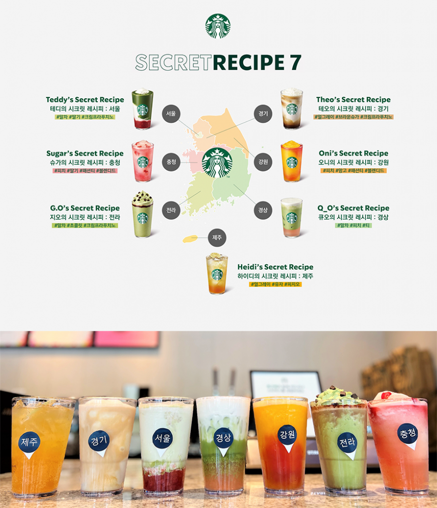 ‘시크릿 레시피 7’는 전국의 스타벅스 파트너들이 창작한 음료 레시피 중 고객 투표를 통해 총 7개 지역(서울, 경기, 강원, 충청, 전라, 경상, 제주)의 대표 음료 1종씩, 총 7개의 음료를 정식 음료로 출시하는 프로젝트이다.