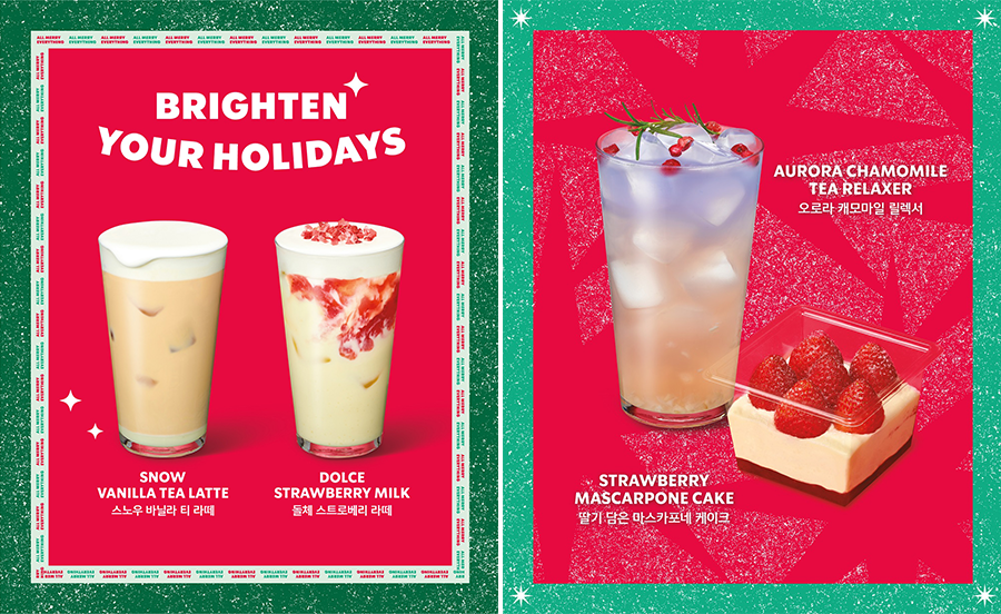 함께 출시되는 ‘돌체 스트로베리 라테’는 연유, 캐러멜의 달콤한 풍미와 새콤달콤한 딸기의 맛이 마치 딸기 케이크를 베어 문 듯한 느낌을 주는 음료로, 스타벅스의 스테디셀러 푸드인 부드러운 생크림 카스텔라에서 영감을 받아 탄생되었다. 부드러운 캐러멜 폼 위에 딸기 토핑을 얹어 연말의 화사한 분위기를 비주얼로 연출했다.