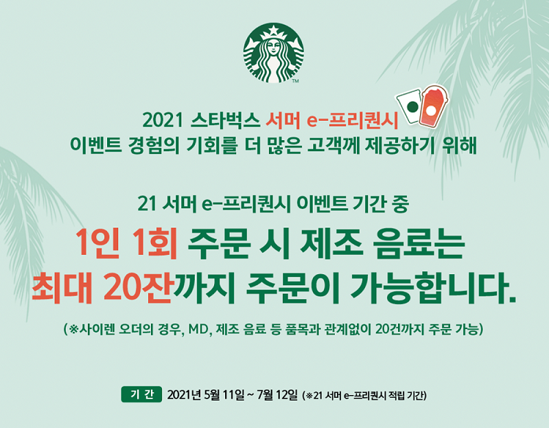MEDIA 글자 크기 보통 크게 아주 크게 공유하기 페이스북 X 카카오톡 링크 복사 링크 복사됨 도구 보기 이미지 다운로드 스타벅스, 여름 e-프리퀀시 이벤트 기간에 1회 음료 주문 최대 20잔으로 제한 운영 2021.05.10 SCK COMPANY