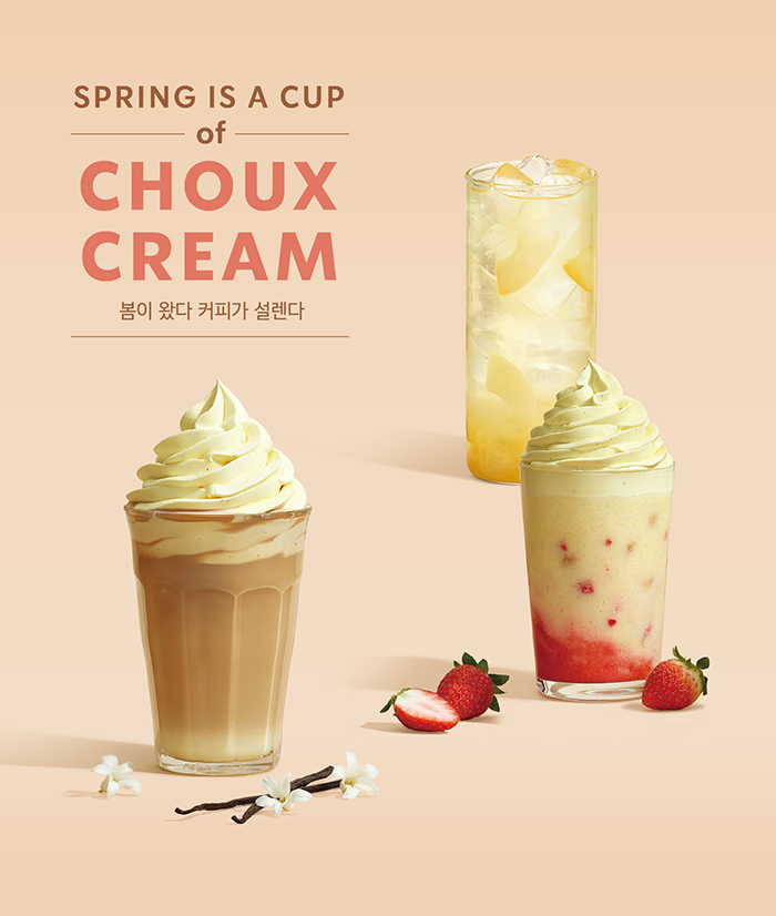 또한, 신제품 음료에 어울리는 푸드로 완두 앙금과 통팥 앙금 빵 사이에 달콤한 연유 버터 크림과 딸기잼을 넣은 ‘딸기 앙모스’, 구운 아몬드 슬라이스와 초콜릿을 입힌 쿠키 슈 안에 부드러운 슈 크림을 넣은 ‘슈 크림 초콜릿 쿠키 슈’ 등의 푸드도 새롭게 선보인다.